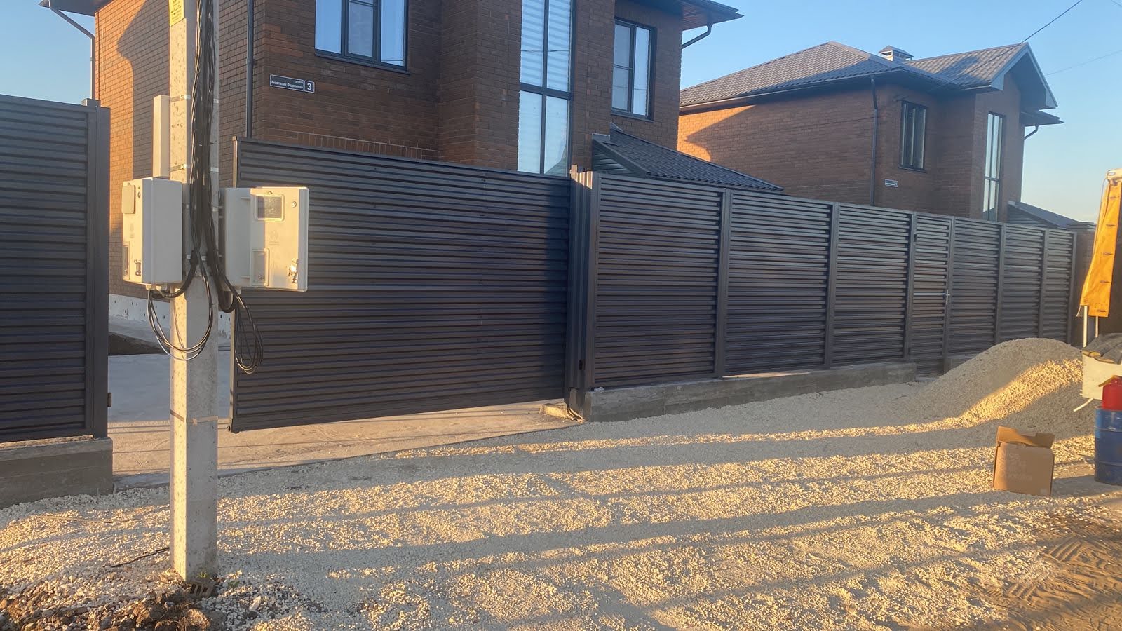 - Вариативность по цветам и секциям — калитки и ворота можно сделать в едином стиле.