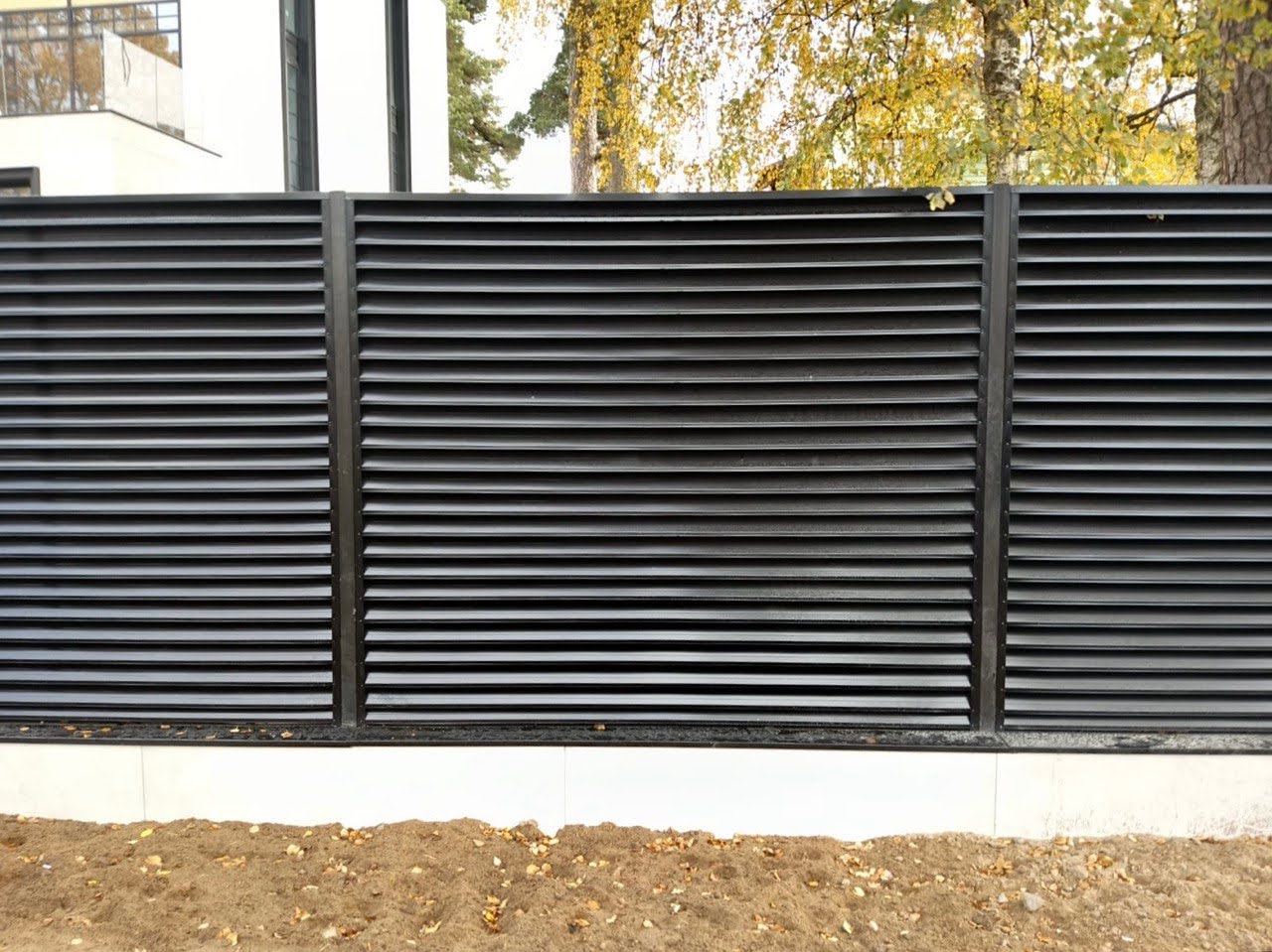 Забор-жалюзи — это современное металлическое ограждение с горизонтальными ламелями, которое одновременно защищает участок и придаёт ему «воздушность». Наклон планок препятствует прямому обзору территории, при этом внутренняя часть остаётся освещённой и проветриваемой. Такое ограждение выигрышно смотрится возле современных домов, террас и коммерческих объектов.
