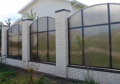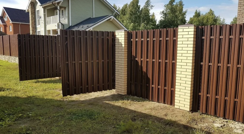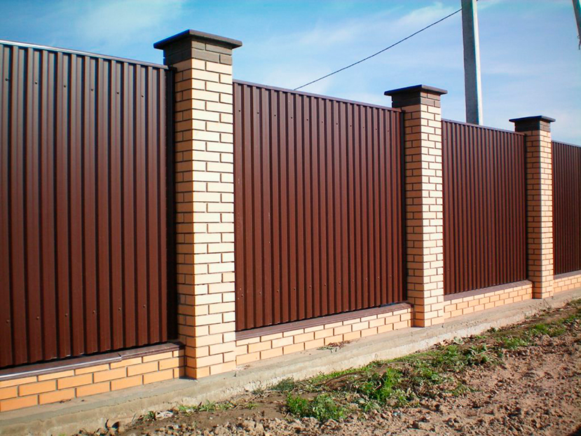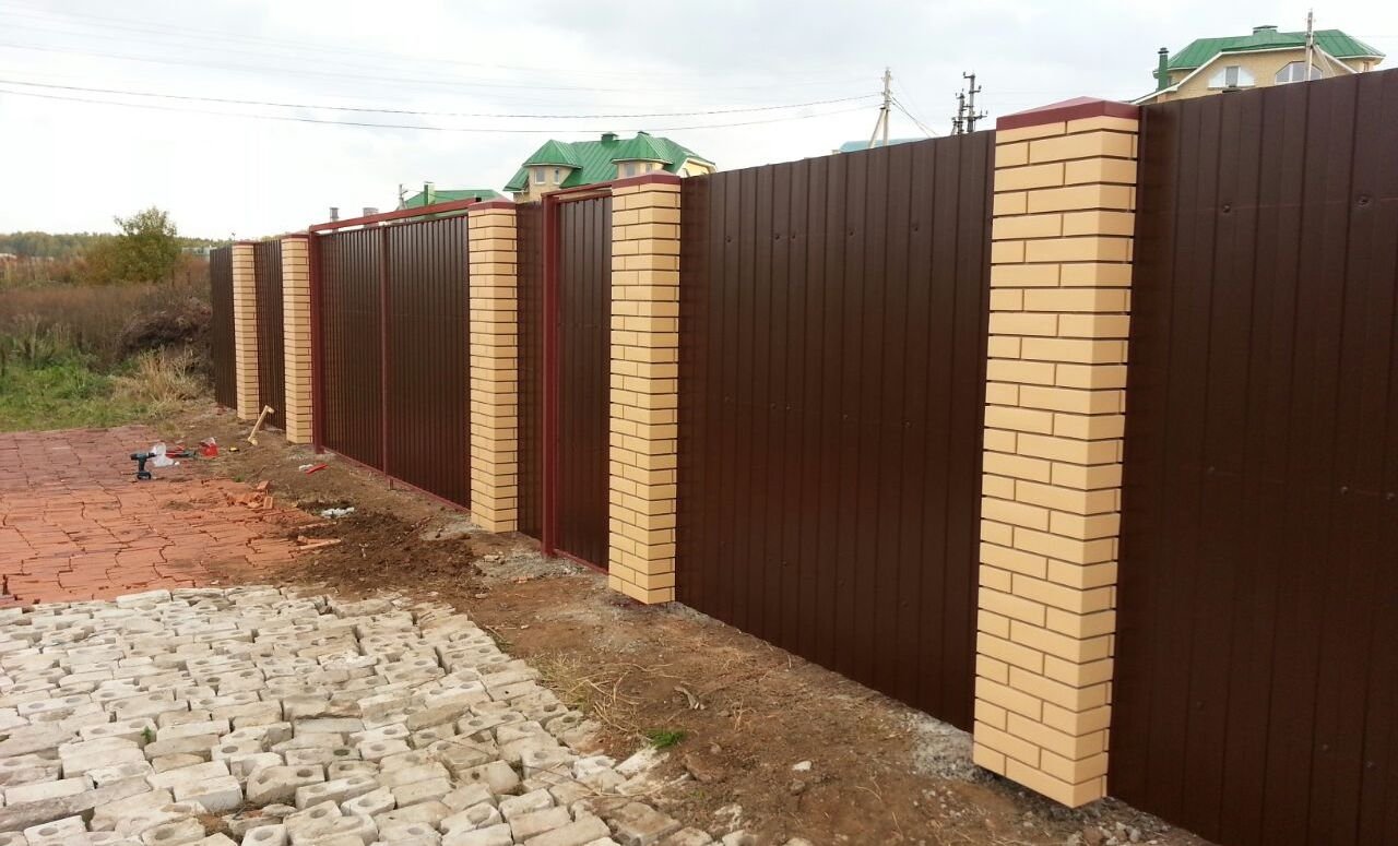 Профнастил вертикальный с кирпичными столбами на ленточном фундаменте